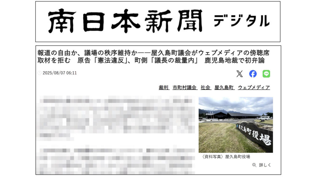 屋久島町議会(石田尾茂樹議長)が市民メディア「屋久島ポスト」の議会取材を拒否しているのは、「表現の自由」などを保障した憲法に違反しているとして、屋久島ポストが町を相手取って提起した「1円訴訟」について、南日本新聞は8月7日、この訴訟の第1回口頭弁論が鹿児島地裁で開かれたことを報じた。