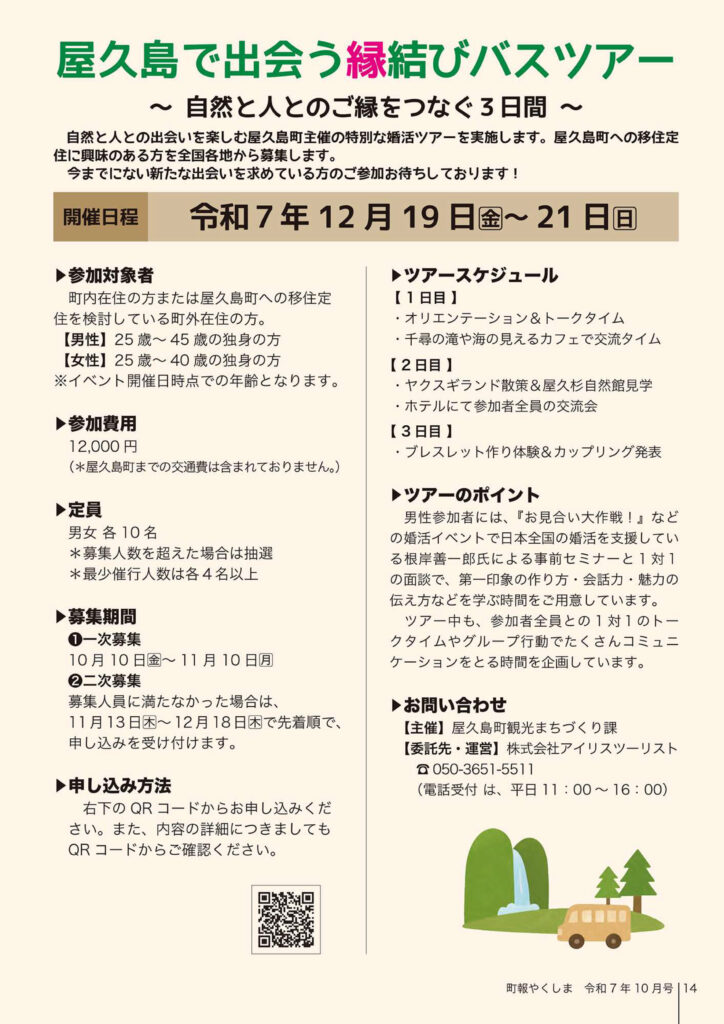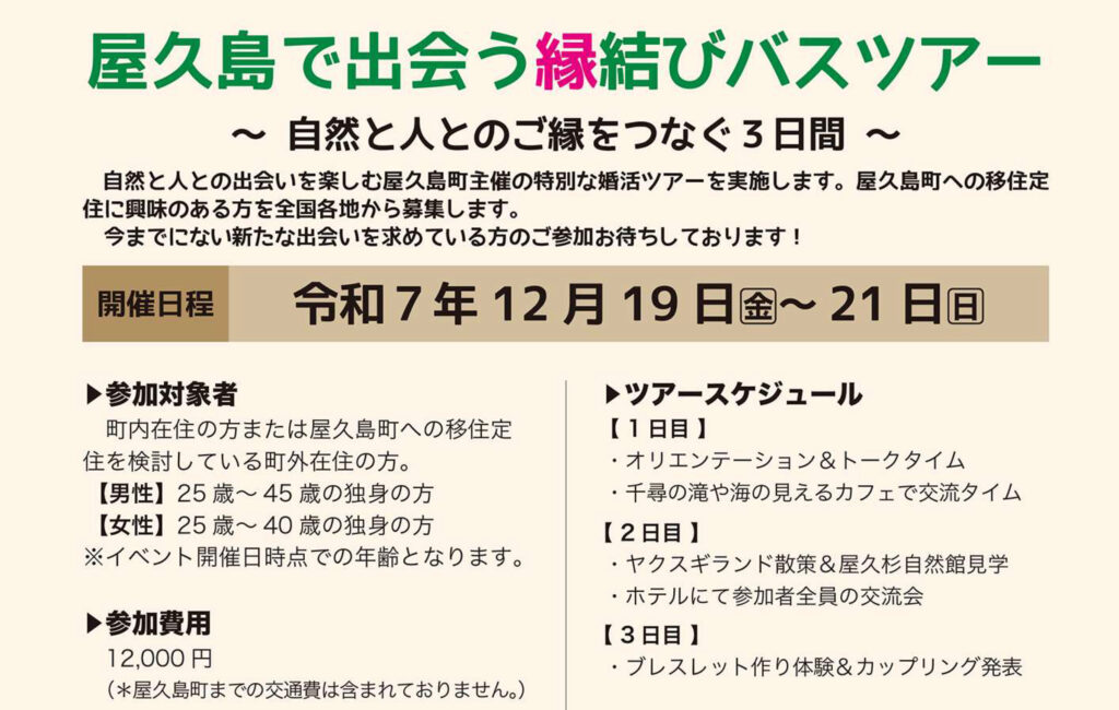 町観光まちづくり課によると、「屋久島で出会う縁結びバスツアー」は同町への移住に興味がある独身の男女を対象に、12月19~21日に町内で実施を予定。参加対象者の条件を「町内在住の方または屋久島町への移住定住を検討している町外在住の方」としたうえで、男性の年齢を25~45歳とする一方で、女性は25~40歳と男性より上限を5歳若く設定した。