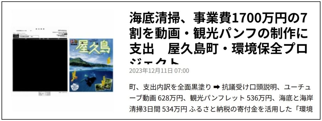 屋久島町がふるさと納税の寄付金を使って実施した海底清掃事業の問題を伝える屋久島ポストの記事