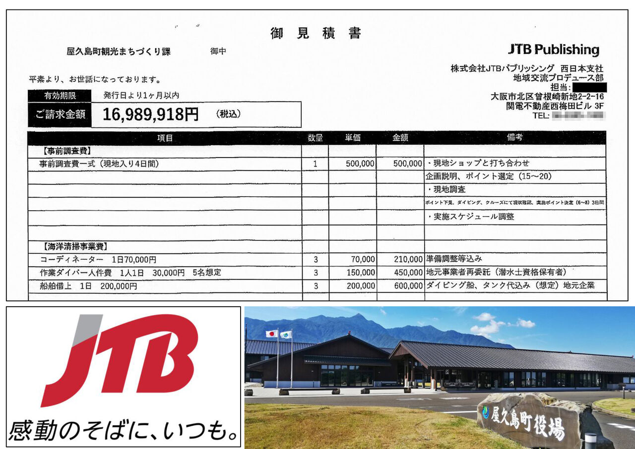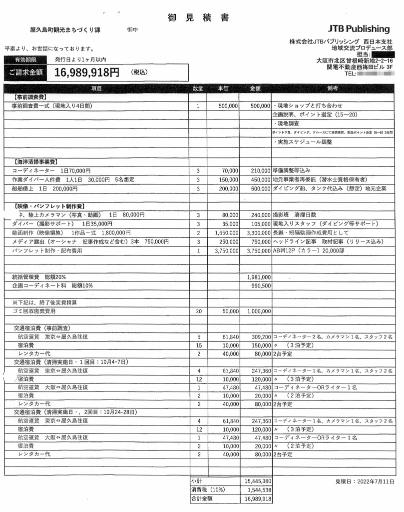 町に提出された見積書によると、JTBパブリッシングが「※下記は、終了後実費精算」としたのは、「ゴミ回収廃棄費用」の100万円(税抜き)と「交通宿泊費」の約157万円(同)の計約257万円(同)だった。