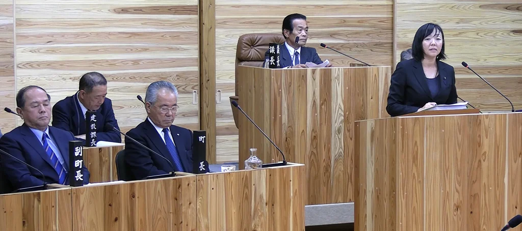 ところが、議事の最後に真辺真紀町議が「議長!」と手を挙げ、静かに自席を立った。黒いスーツに身を包んだ真辺町議は、足早に議場の前方へと進み、一礼をして演壇に立つと、同僚議員や傍聴する住民たちと向かい合った。真辺町議のすぐ近くには荒木町長が座り、じっと視線を下に落として、うつむいている。