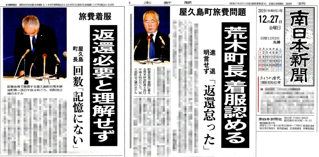 その夜、鹿児島のテレビ各局は、シルバー割引の利用を認めた荒木町長の記者会見について、一斉にニュース番組で報じた。さらに翌日の南日本新聞は、一面と社会面のトップに<荒木町長 着服認める><返還必要と理解せず>の大見出しを掲げ、会見で荒木町長が深々と頭を下げる写真を掲載した。