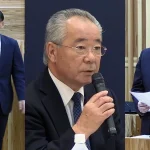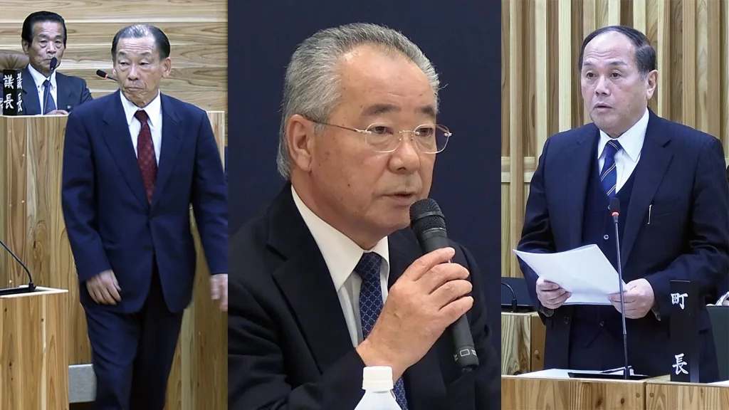 【左】出張旅費の不正精算の責任を取って議長を辞任した岩川俊広町議(手前)=2020年1月10日、屋久島町議会【中】出張旅費の着服疑惑について記者会見する荒木耕治町長=2019年12月26日、屋久島町宮之浦のホテル【右】出張旅費の不正精算について謝罪する岩川浩一副町長=2020年3月6日、屋久島町議会