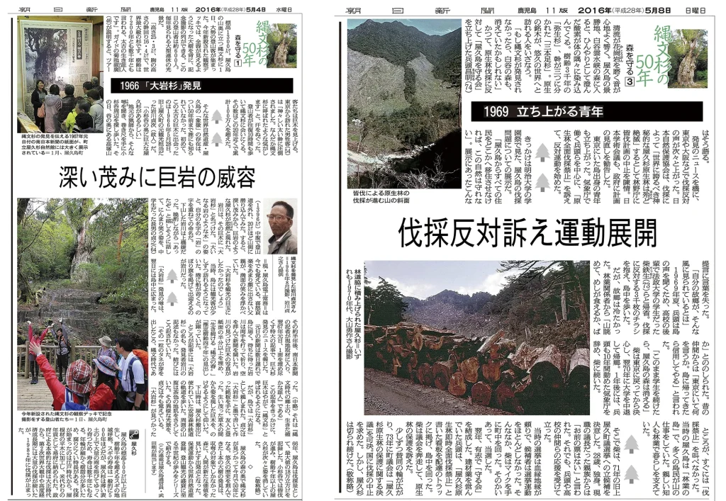 翌2016年になると、口永良部島の取材は落ち着き、再び屋久島の自然に向き合えるようになった。ちょうどその年は、屋久島を象徴する縄文杉が発見されてから半世紀の節目にあたり、「縄文杉の50年」と題するシリーズ記事を朝日新聞の鹿児島版で連載。国が続けた大伐採に対する反対運動で、島の青年たちが守り切った原生林が世界自然遺産に登録されるまでの歴史などを紹介した。