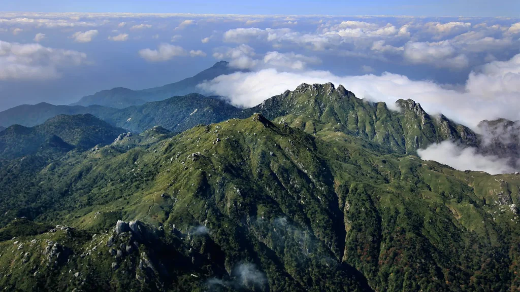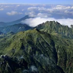 屋久島の山中に連なる宮之浦岳(中央)などの峰々