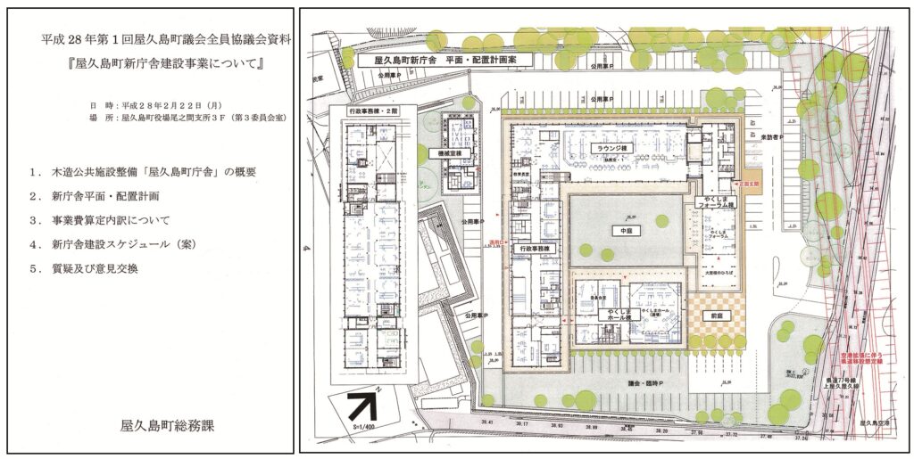 屋久島町が町議会に示した新庁舎建設事業の資料。町議会に示しているにもかかわらず、町の担当職員は取材に対して、「内部資料」だと言って詳細な説明を拒んだ
