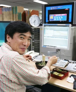 写真部デスク時代の筆者。夕食の間も常にデスクに張り付いていた=2012年4月、東京都中央区築地の朝日新聞東京本社