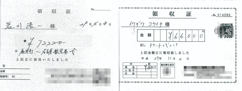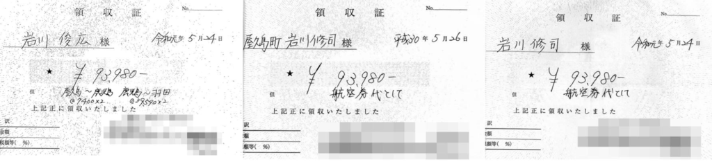 岩川俊広議長についても、東京出張で町に提出した航空券代の領収書には「¥93980」と記載されていたが、領収書を発行した旅行会社には、航空券を販売した記録が残されていなかった。さらに岩川修司副議長にも、2回の東京出張で不正が見つかった。いずれの出張でも、航空券代として「¥93980」と記載された領収書を1枚ずつ提出していたが、私が入手した関係文書の販売記録には、両方とも半額ほどの航空券代が記録されていた。
