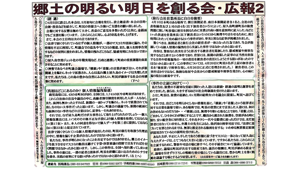 また、告発人のうち石田尾町議を除く5人は、告発の準備を進めていた4月初めに「郷土の明るい明日を創る会」と称する市民団体を結成し、私たち記者や一部の町議を誹謗するビラを町内の6000世帯に全戸配布。「個人情報が警察ではなく、一部のマスコミに漏洩され、個人を攻撃する材料に使われた」と中傷したほか、「人権を無視したかのようなマスコミの取材や報道、あるいは議会における追及」は「常軌を逸している」などと非難していた。