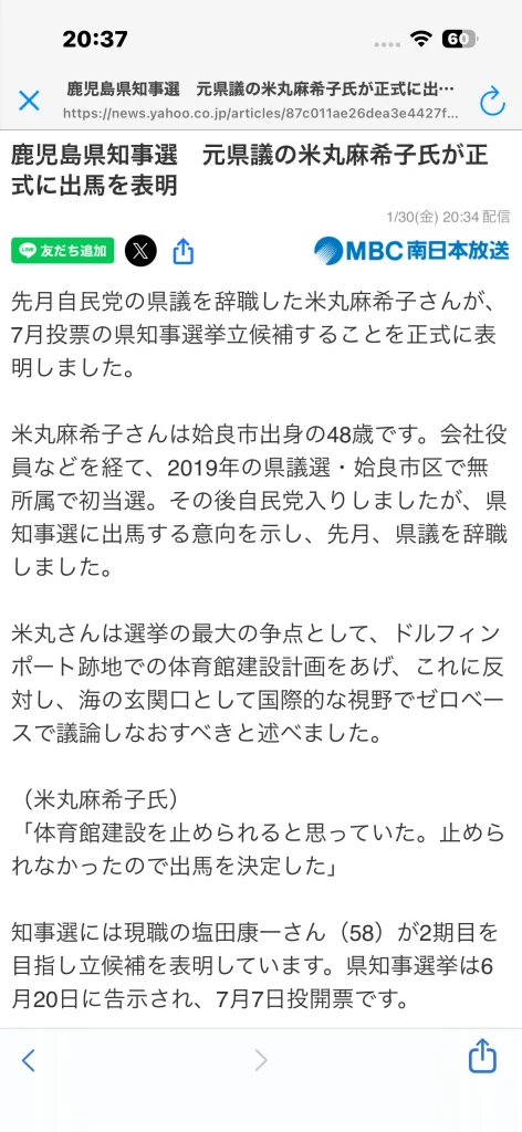 ヤフーニュースで「鹿児島県知事選 元県議の米丸麻希子氏が正式に出馬を表明」と誤って報道