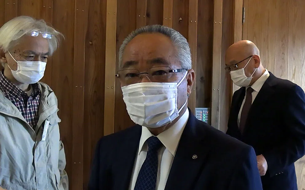 全員協議会が終わったのちに取材に応じる屋久島町の荒木耕治町長(中央)=2019年11月26日、屋久島町役場の議会棟