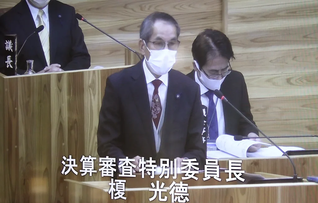 この採決の前にあった報告で、10月に事前審査をした決算審査特別委員会の委員長を務める榎光徳町議は、「一部職員の不適切な対応により、多くの町民や町内外に大きな失墜を与えた」と指摘。補助金不正請求の第一義的な責任は工事業者側にあるとしながら、「事業を監督する町長はじめ職員の責任は多大だ」と厳しく批判した。