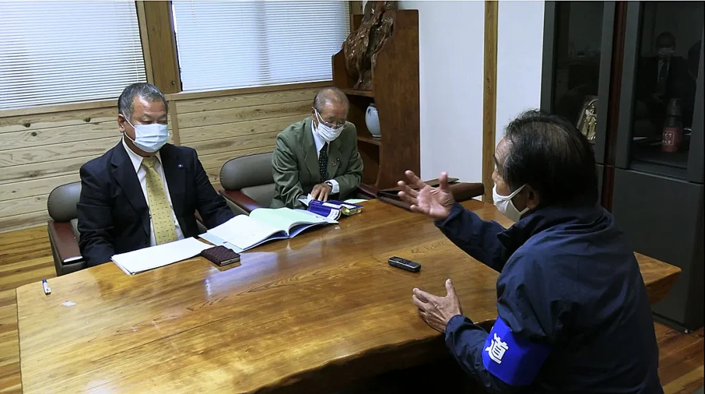 議場での取材について石田茂樹議長(左)と交渉する屋久島ポストの鹿島幹男代表(右)=2019年11月26日、屋久島町役場の議会棟