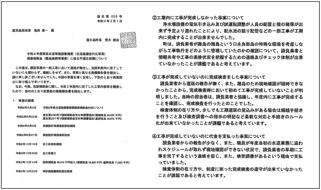 国への虚偽報告について、荒木町長は「口永良部島での実施で協力支援が受けにくい状況だったことに加え、新型コロナウイルス感染症の発生など予想できない事案が重なった」と釈明。一方、虚偽報告の事実を国に伝えず放置したことや、工事が未完成の段階で、工事代金を前払いした責任については、全く言及しなかった。