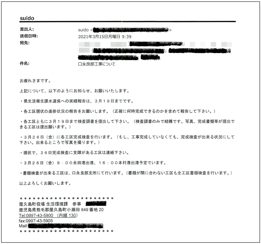 確かに、私たちが情報公開請求で入手した記録文書のなかには、担当職員が工事の未完成を認識したまま、完成検査を実施したことがうかがえるメールがあった。2021年3月26日の完成検査を前に、担当職員が3月15日に送信した<口永良部工事について>と題するメールには、次のような指示が書かれていた。