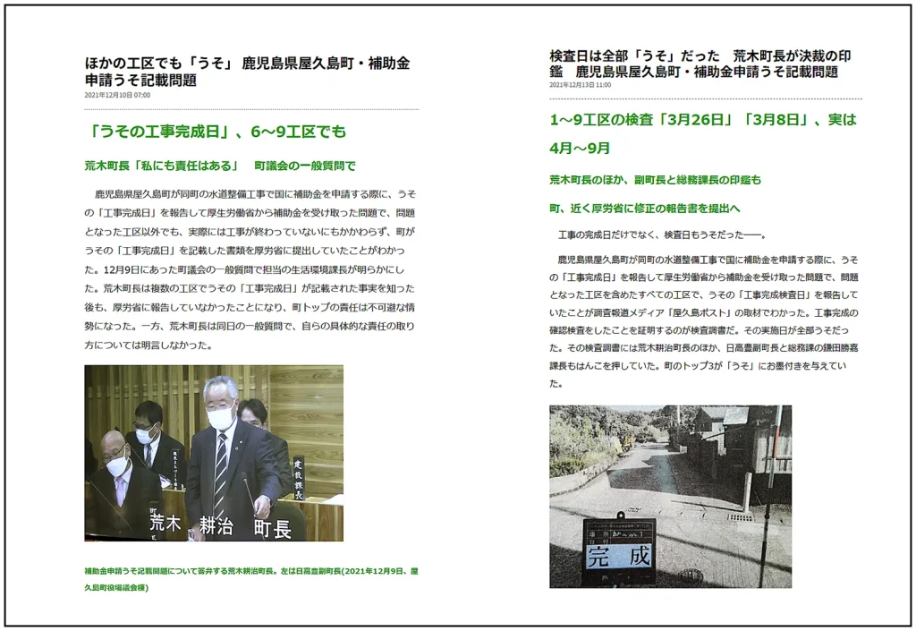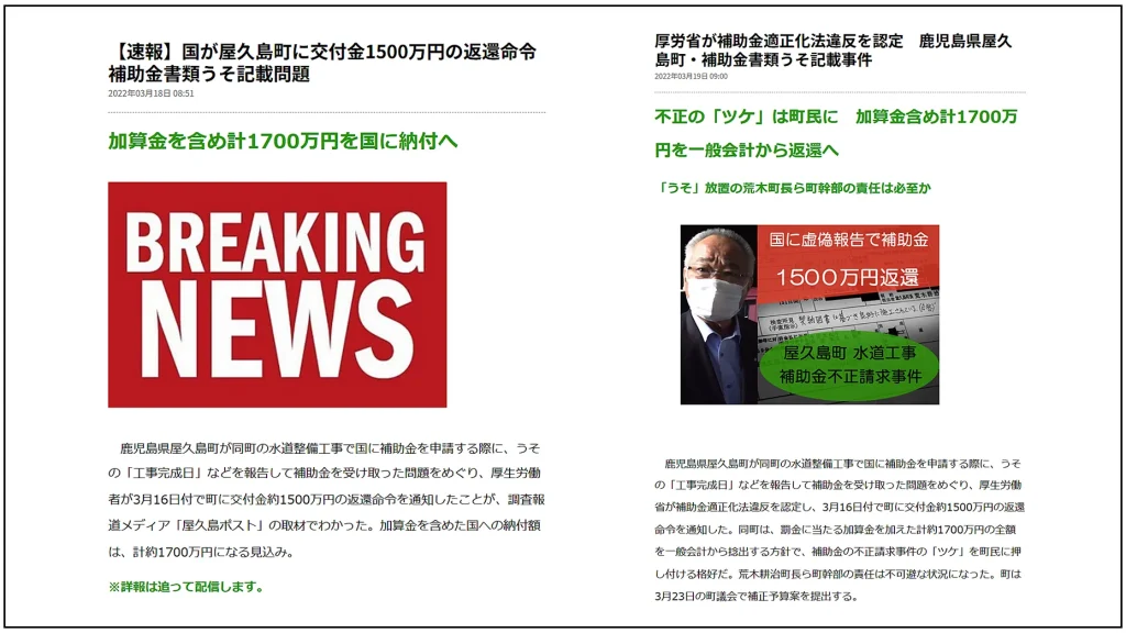 まさか、屋久島ポストの創刊日に配信した記事がきっかけになり、国が補助金の返還命令を出す結果になるとは思わなかった。国民の貴重な公費に対する不正であり、町から違法な行政手続きをなくすためにも、ぜひとも報道すべき問題ではあったが、正直なところ、ここまでの成果が得られるとは予想もしていなかった。