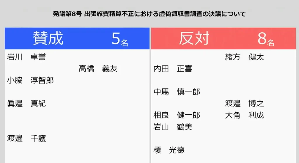 討論が終わると採決に入り、反対9人、賛成6人で百条委設置案は否決された。一連の出張旅費不正問題で百条委員会による調査が退けられたのは4回目となったが、この採決では異例の事態が生じていた。虚偽の領収書を使っていた日高町議と岩川俊広町議の2人が、こともあろうことか、この採決に自ら参加していたのだ。