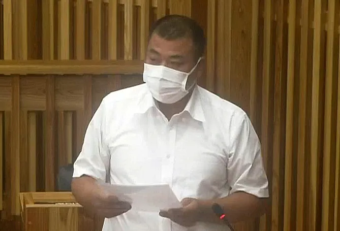 虚偽領収書の不正調査をする百条委員会の設置案に賛成意見を述べる渡辺千護町議==2022年6月22日、屋久島町議会の議会中継モニター画面を撮影
