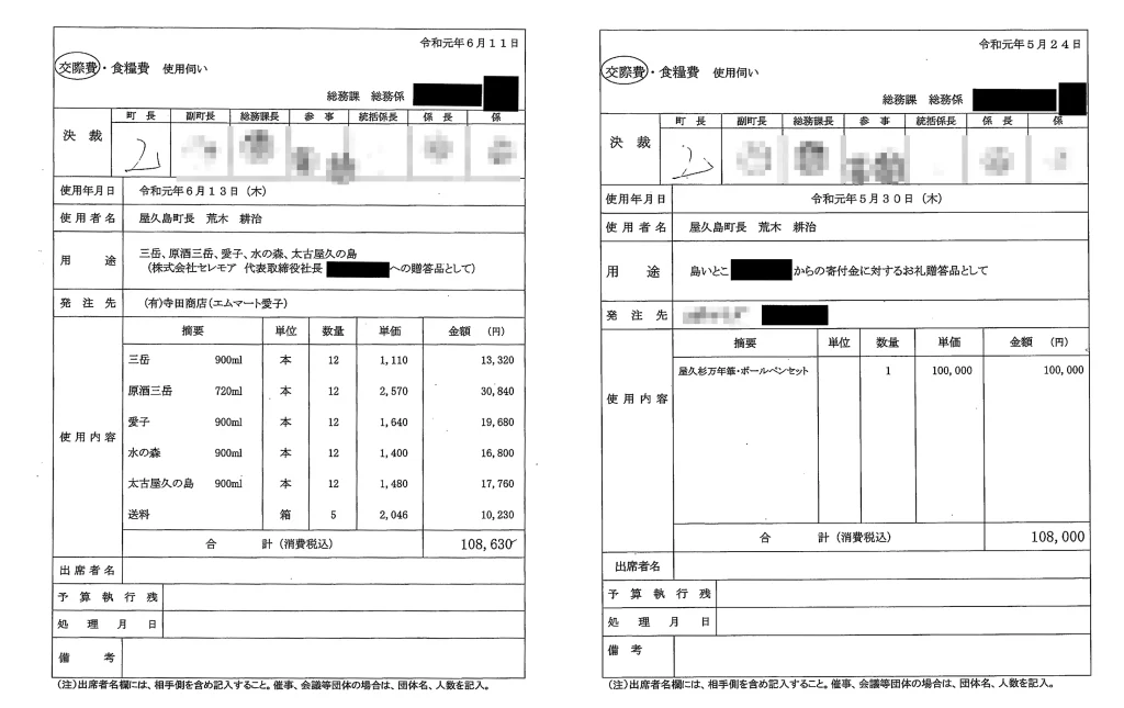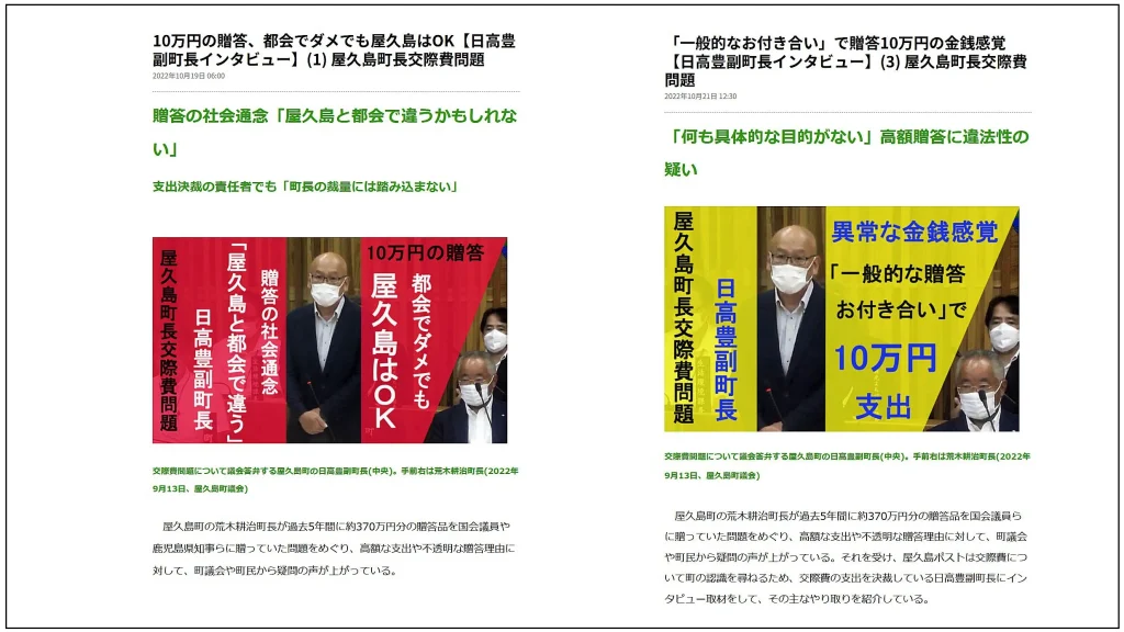 「屋久島町として(公費で)贈っているので、(認識の違いは)受け取った側の問題だ。(町長と)関係が近い分、そう(私費で贈っていると)受け取ったのかもしれない」