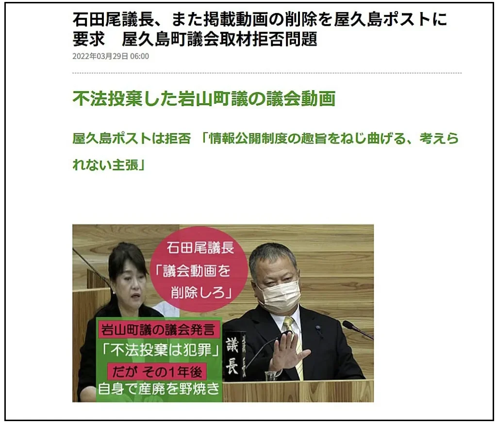 ところが、私たちが2022年3月10日に<【動画】で検証 岩山鶴美町議の議会発言 犯罪性を認識>と見出しをつけて、短く編集した議会動画を屋久島ポストで配信すると、思わぬ反発があった。翌11日に石田尾議長から私に電話があり、いきなり「著作権法に違反している」と主張して、動画の削除を求めてきたのだ。