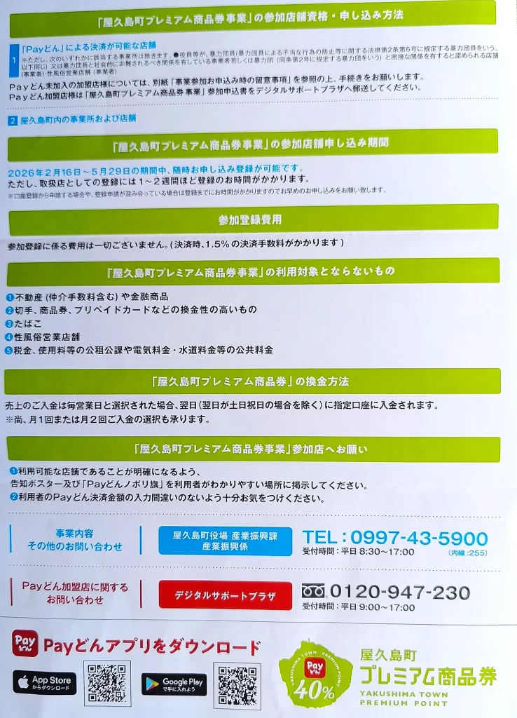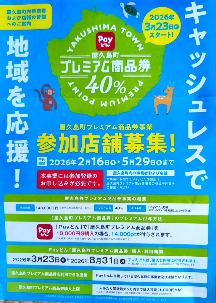 屋久島町、町内に「プレミアム商品券40%」のチラシを配布し参加業者を募集
