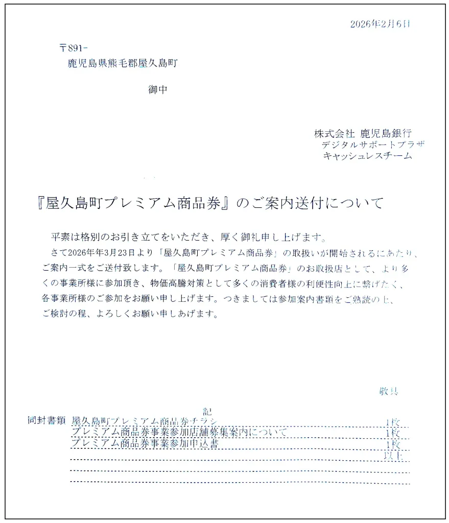 ところが町は、今年1月になってから追加の予算を確保し、プレミアムポイントを1万円あたり2000円から4000円に引き上げることを決定。「屋久島町プレミアム商品券事業 参加店舗募集!」「10,000円分購入の場合、14,000ptが付与されます」などと記載したチラシを作成したうえで、鹿児島銀行が2月6日付でチラシを同封した案内状を町内の事業者や店舗に送付した。