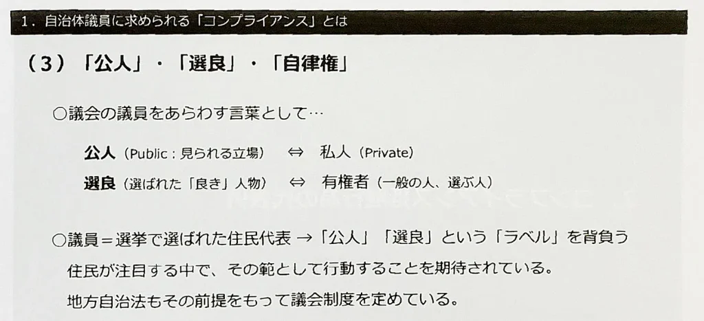 研修会では、政治倫理に詳しい専門家が提供する映像教材が流され、まずは「有権者から負託を受けた議員は、住民の期待や信頼を裏切ってはいけない」「不祥事があった場合は全住民への説明責任を負う」と指導があった。さらに「議員は『選ばれた良き人』と見られる立場」「違法かどうかではなく、人から見てどうかを考える」など、住民の代表として求められる心構えが伝えられた。