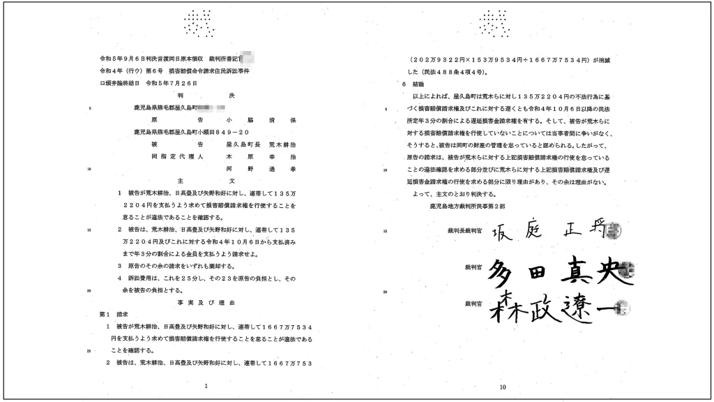 しかし幸いにも、裁判所は町の主張を退けた。2024年9月25日に判決が言い渡され、約135万円の賠償責任を認めた一審判決が維持されたのだ。しかも、全責任は町長にあると判断され、荒木町長が1人で賠償責任を負う結果となった。