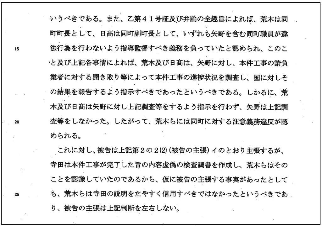 数分後、小脇さんはA4判で10ページの判決文を手に戻ってきた。すぐに私は判決文を受け取り、ざっと目を通した。どうやら住民側が「一部勝訴」という内容のようで、判決理由には荒木町長らの責任について、次の趣旨の文言が並んでいた。