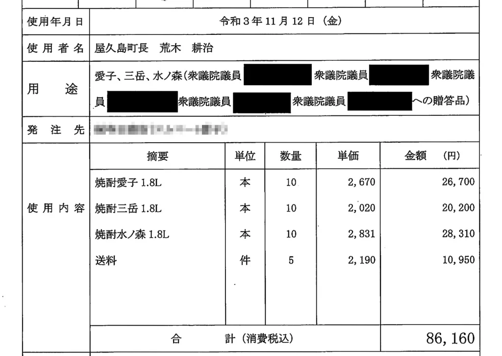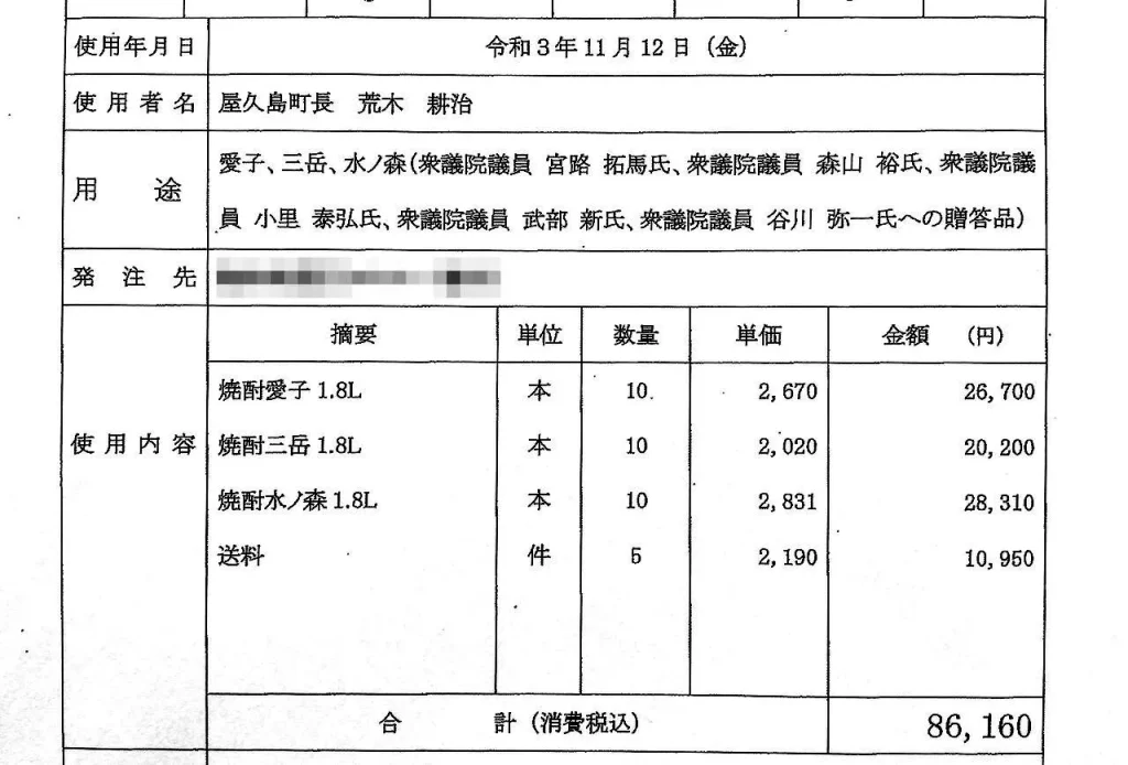 いずれの議員にも、2021年11月12日に焼酎を6本ずつ贈り、合計の支出額は約6万円になった。宮路、小里の両議員への贈答理由は<日頃から離島振興を含む各種要望活動に協力をいただいている>と説明。また、谷川、武部の両議員は自民党離島振興特別委員会のメンバーで、<日頃から全国離島振興協議会の用務遂行の場で様々な尽力をいただいていた>とした。