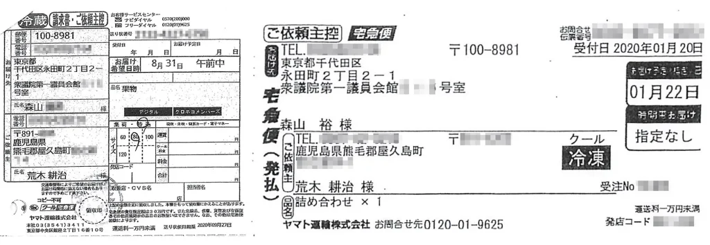 送り状は証拠提出され、1枚は2020年1月20日に<詰め合わせ>を森山事務所の<森山裕様>宛てに贈ったものだった。もう1枚は同年8月28日に、森山議員とは下の名前が違う<森山〇〇様>(※証拠文書では実名)宛てに<果物>を贈ったときのもので、いずれも差出人の住所は荒木町長の個人宅だった。