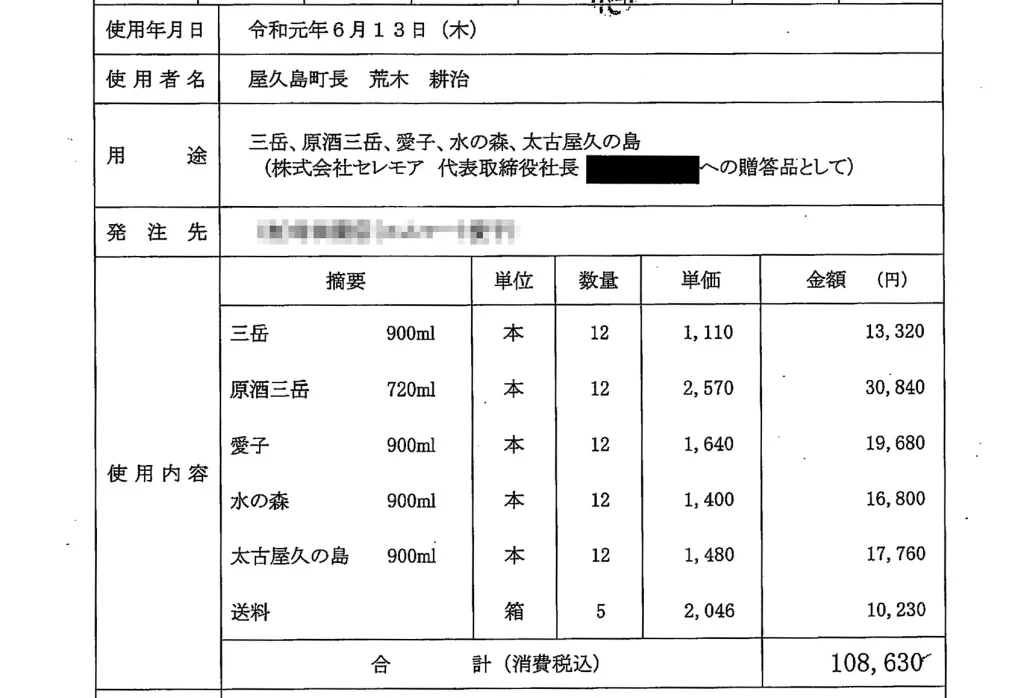 <(町は)衆議院議員5人に贈答した理由として「日頃から離島振興を含む各種要望活動に協力をいただいている」「日頃から全国離島振興協議会の用務遂行の場で様々な尽力をいただいていた」などと主張しているが、5人の衆議院議員の回答を踏まえると、一連の贈答に対して、屋久島町民の公費を支出することは不適正かつ不適法であることは明らかである>