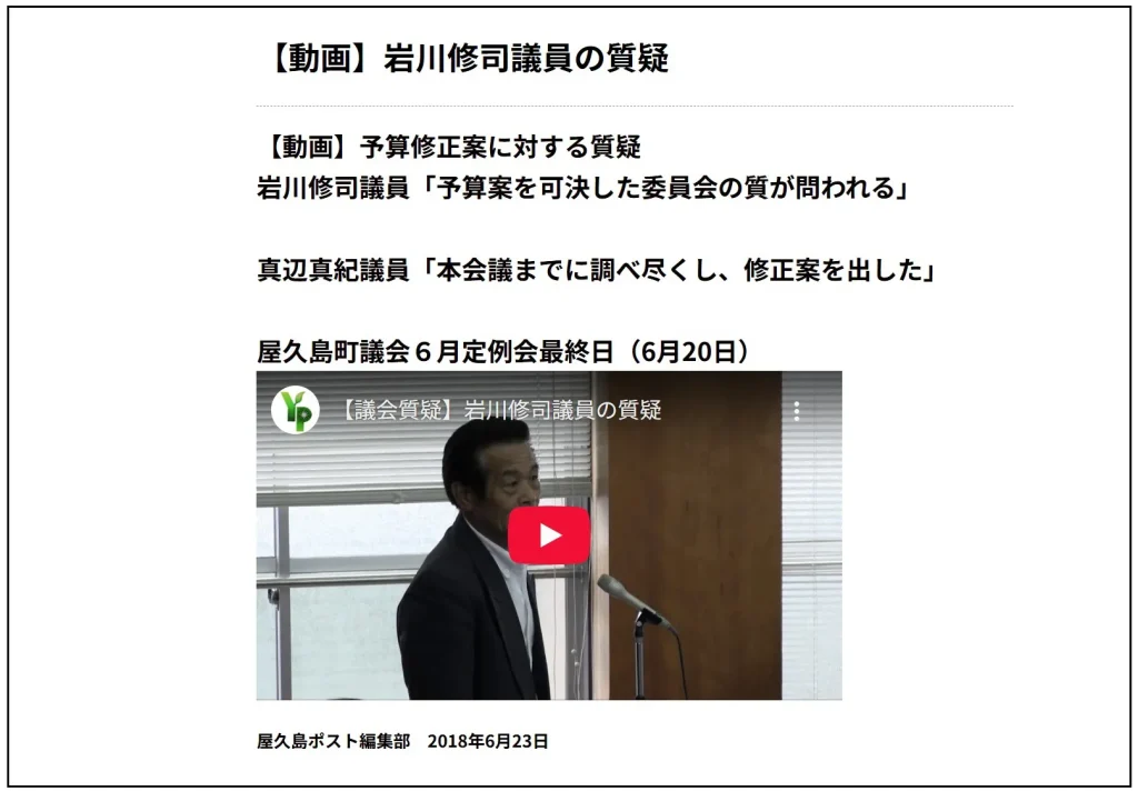 岩川議長は何度も電話をかけてきて、私が2018年6月にブログで配信した数本の議会動画を削除するように求めていた。