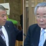 【左】物価高支援で利用する「Payどん」について一般質問する渡辺千護町議【右】渡辺千護町議の一般質問に答弁する荒木耕治町長=いずれも2026年3月11日、屋久島町議会、町議会YouTubeチャンネルより