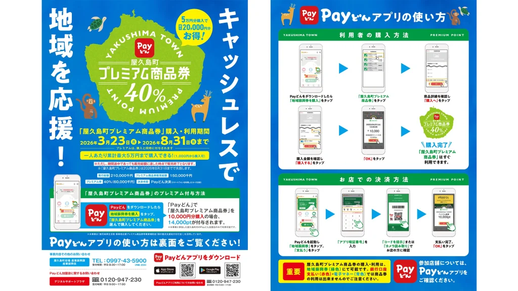 鹿児島銀行の「Payどん」アプリを利用した屋久島町プレミアムポイントの案内チラシ