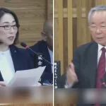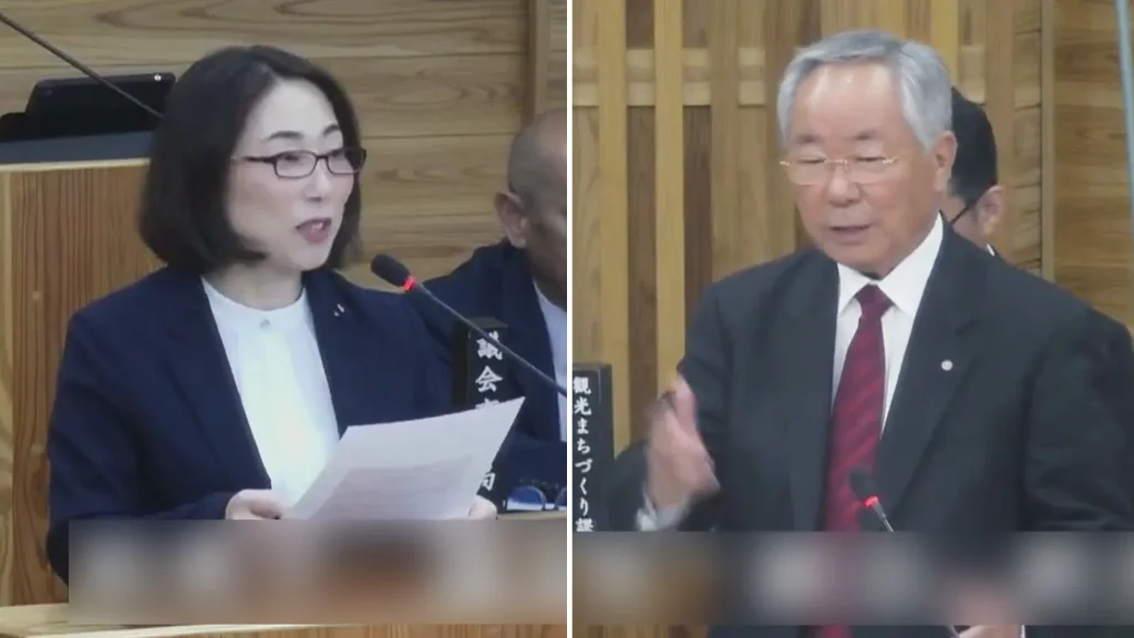 【左】保育園留学や特定乳児等通園支援事業などについて一般質問する天辰絵美子町議【右】天辰絵美子町議の質問に答弁する荒木耕治町長=2026年3月12日、屋久島町議会、町議会YouTubeチャンネルより