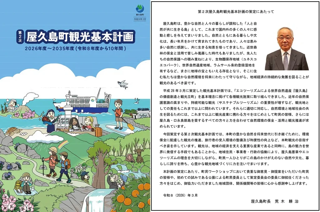 第2次屋久島町観光基本計画書の表紙(左)と荒木耕治町長のあいさつ文