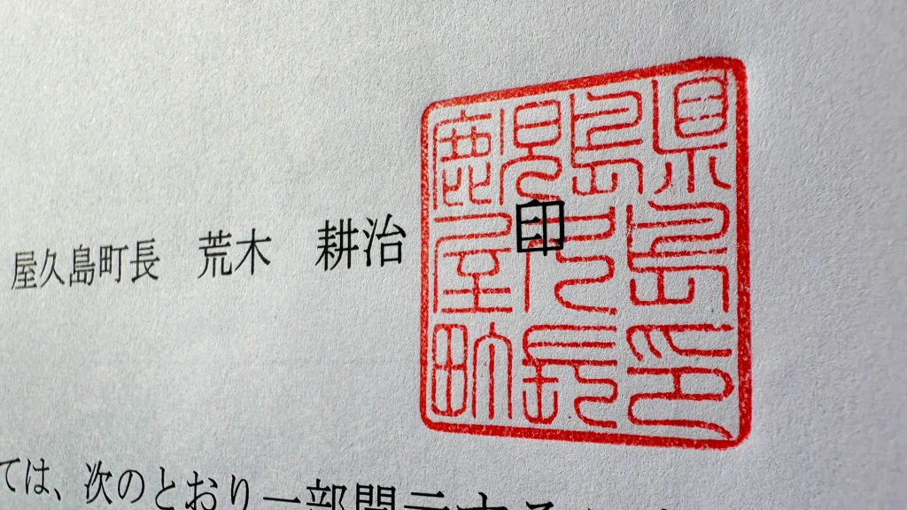 屋久島町の荒木耕治町長の名前で出された文書に押印された公印=屋久島ポスト撮影