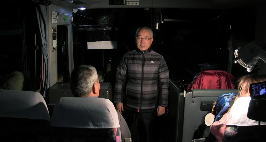 入山協力金の横領事件を受けて、縄文杉方面に向かう荒川登山バスの中で登山客に謝罪する屋久島町の荒木耕治町長=2019年3月1日、屋久島町安房の屋久杉自然館前