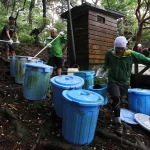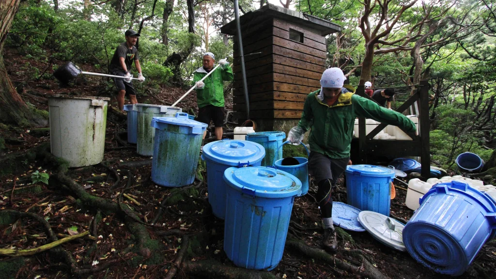 縄文杉に近い高塚小屋のトイレに溜まったし尿を運び出す山岳ガイドら=2016年7月