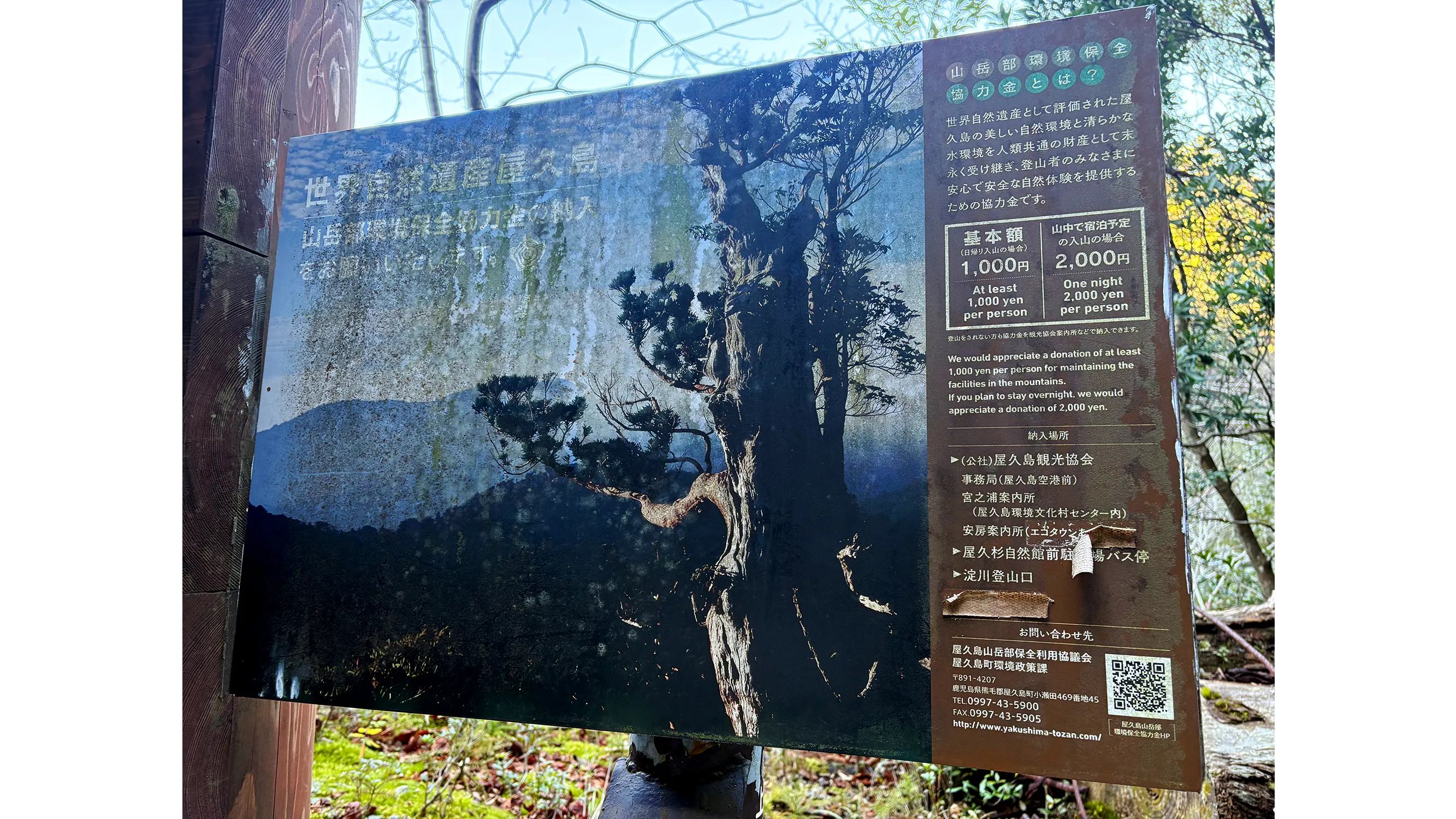 登山者に入山協力金納入の協力を求める荒川登山口の看板。2017年3月の設置から9年近く過ぎ、コケや汚れで表示が読みづらくなっている=2025年12月、屋久島ポスト撮影