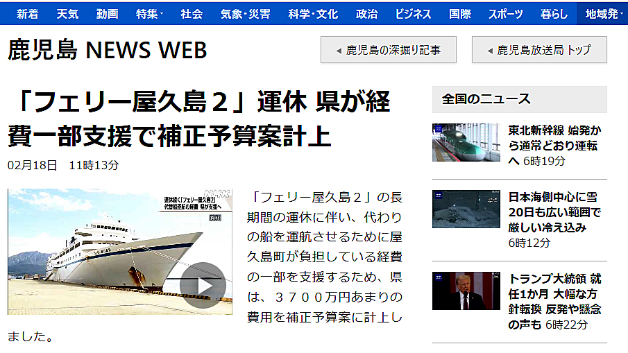 【NHK報道】鹿児島県が代船運航費の一部を負担へ フェリー屋久島2運休問題 2025.02.20 フェリー屋久島2運休 yakushima-post 屋久島ポスト – The Yakushima Post